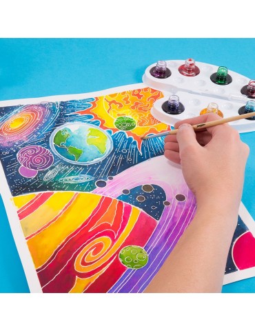 Peignez avec 7 encres aquarelles, sans pouvoir dépasser, ces deux magnifiques tableaux illustrant l'espace et ses planètes. Une fois la lumière éteinte, les contours brilleront de mille feux !