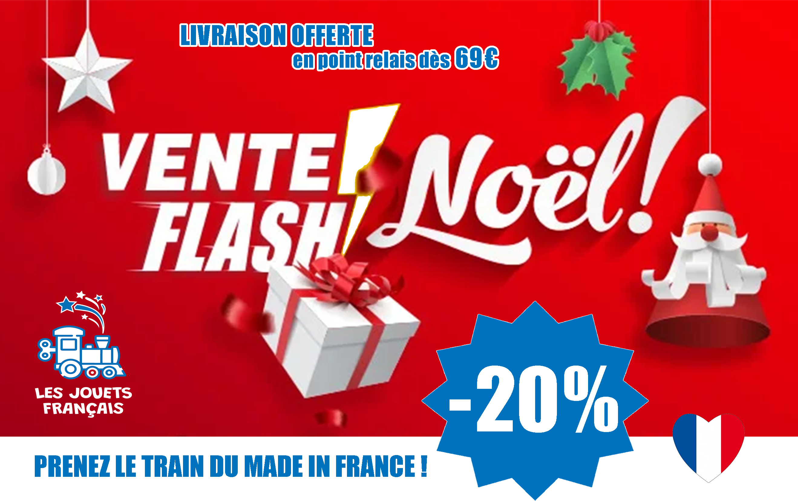 * Une réduction de 20% vous est proposée sur l'ensemble du catalogue de la boutique en ligne Les jouets français, hors frais de livraison. Pour bénéficier de cette réduction, rendez-vous dans votre panier une fois votre sélection de jouets faite, cliquez sur "Vous avez un code promotionnel" (au-dessus du bouton "Payer"), renseignez le code "NOEL-20%" puis cliquez sur "Ajouter"