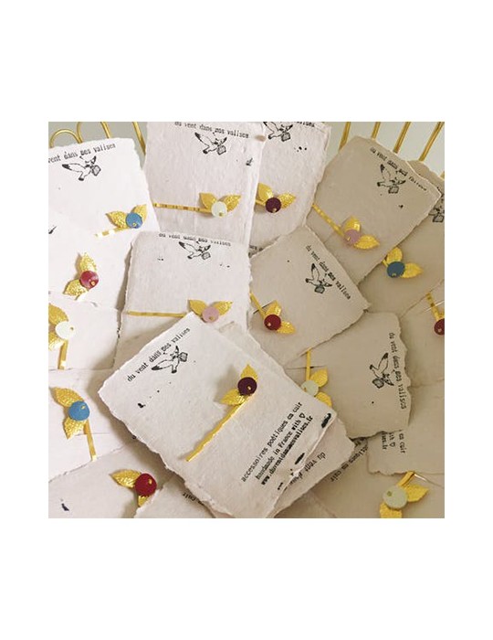 Les pinces sont présentées sur des supports cartonnés ou en papier artisanal épais.