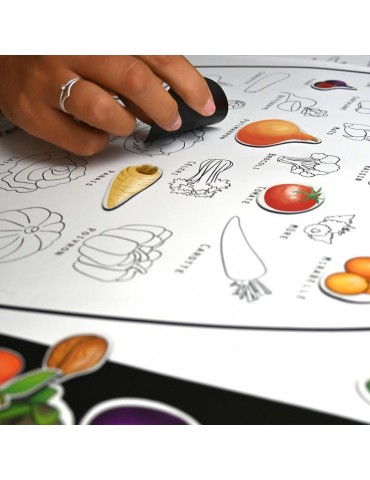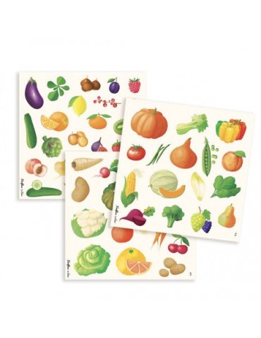 - 3 planches de magnets fruits et légumes (56 magnets) de taille adaptée aux enfants à partir de 3 ans.