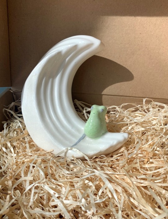 Jolie boite à dent lune avec sa souris verte en céramique naturelle, boite creuse pouvant contenir les dents de laits. Fermeture à l'arrière avec un joli bouchon en liège naturel.