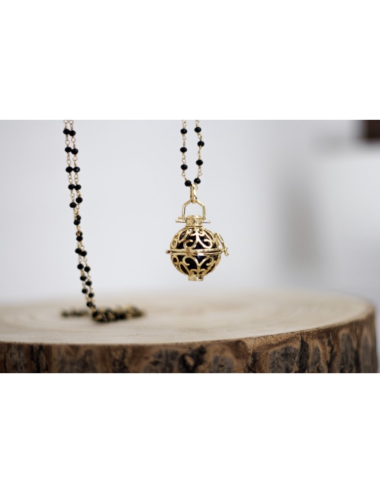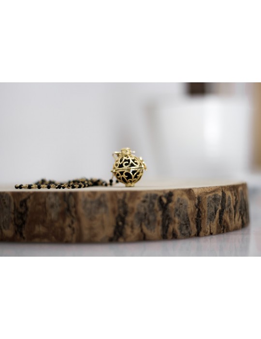 Le bola de grossesse est un bijou qui peut être en argent, cuivré ou même doré. Il est destiné aux femmes enceintes. Le pendentif émet un bruit doux de clochette quand il bouge qui apaise le bébé tout au long de la grossesse. La particularité de cette chaine qui est d'une longueur 114cm, les perles recouvrent toutes de la longueur de la chaine, ce qui permet une utilisation réversible en collier sautoir simple sans le bola après l'accouchement ou même en double tour de cou.