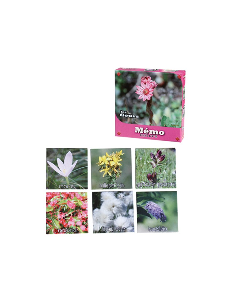 Jeu de mémory avec des photos de fleurs, sur chaque carte il y a le nom de la fleur en français et en anglais