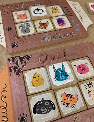 Bois, peinture acrylique, tissu, vernis adapté aux enfants