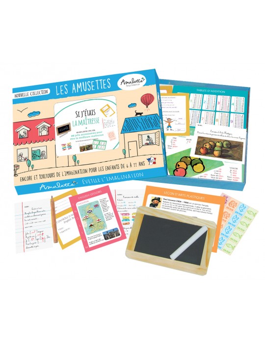 1 diplôme de maître ou maîtresse 1 livre d'appel 4 leçons : tables d'addition, tableau de conjugaison , arts plastiques, le lapin 4 petits livrets d'anglais 8 contrôles d'anglais (4 copies vierges et 4 copies différentes à corriger) 4 dictées à trous 4 copies d'exercices de maths 1 planche de 32 bons points 4 images 1 mini-ardoise en bois 1 craie 1 crayon