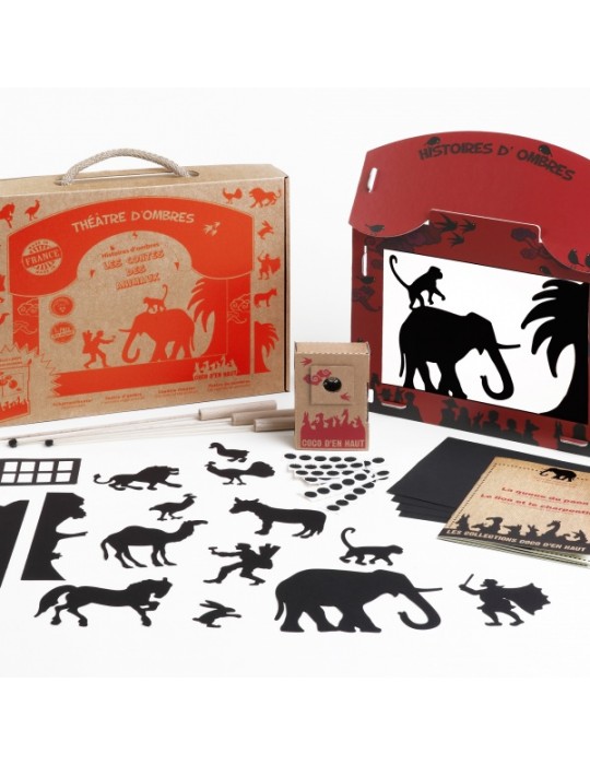 1 théâtre en carton rigide à assembler - 1 livret de mise en scène avec 2 histoires sur les animaux - 15 silhouettes prédécoupées pour raconter les histoires du livret - 4 feuilles noires pour créer les silhouettes que tu vas imaginer - 60 pastilles adhésives - 3 baguettes de manipulations - 1 lampe à silhouettes à monter soi-même (3 piles AAA non fournies)