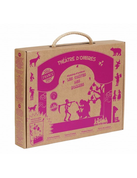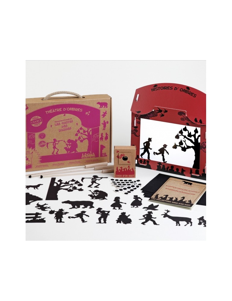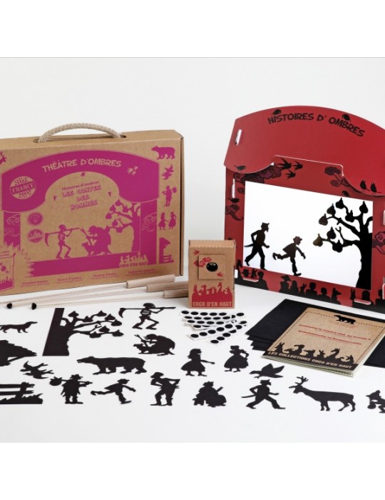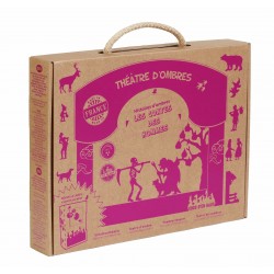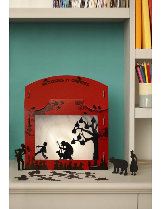 Un petit théâtre d'ombres en carton, avec deux histoires prêtes à être racontées et le matériel nécessaire pour créer tes silhouettes.