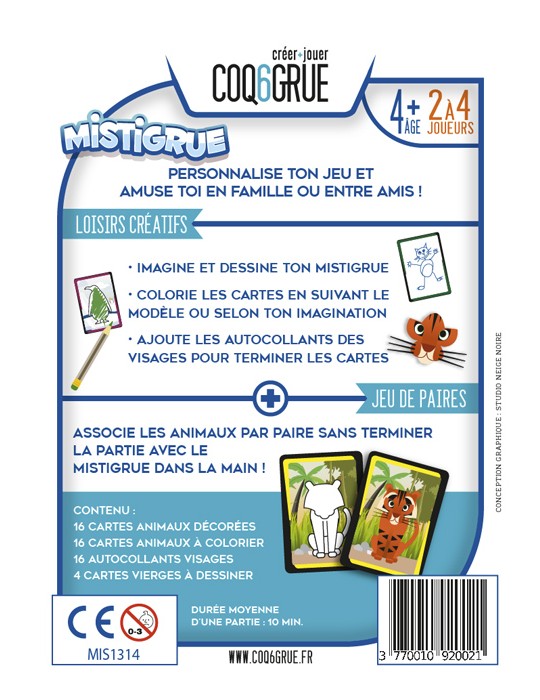 Mistigrue est un jeu 2 en 1 qui associe jeu du Mistigri et du loisir créatif qui permet d'imaginer son Mistigrue, de colorier les cartes en suivant le modèle ou selon son imagination et d'ajouter des autocollants pour terminer les cartes.