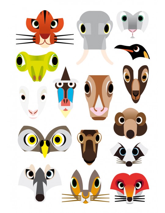 16 cartes animaux décorées - 16 cartes animaux à colorier - 16 autocollants visages - 4 cartes vierges à dessiner