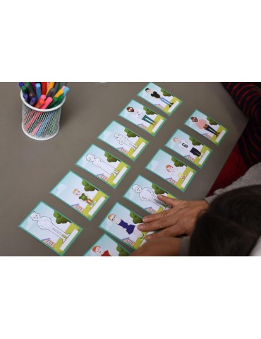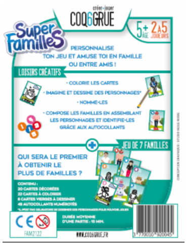 Super familles est un jeu 2 en 1 mêlant jeu des 7 familles et activité créative. Coloriez les cartes, imaginez et dessinez les personnages, notez-les et composez les familles en assemblant les personnages et identifiez-les grâce aux auto-collants.
