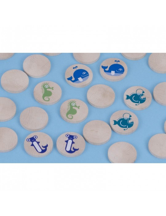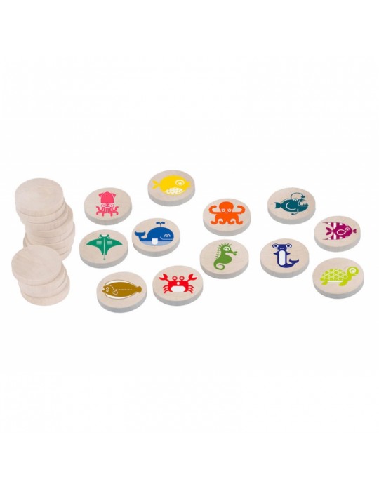 Un jeu de mémory de 24 pièces en bois sur le thème des animaux marins. 24 stickers à coller soi-même pour s’amuser.