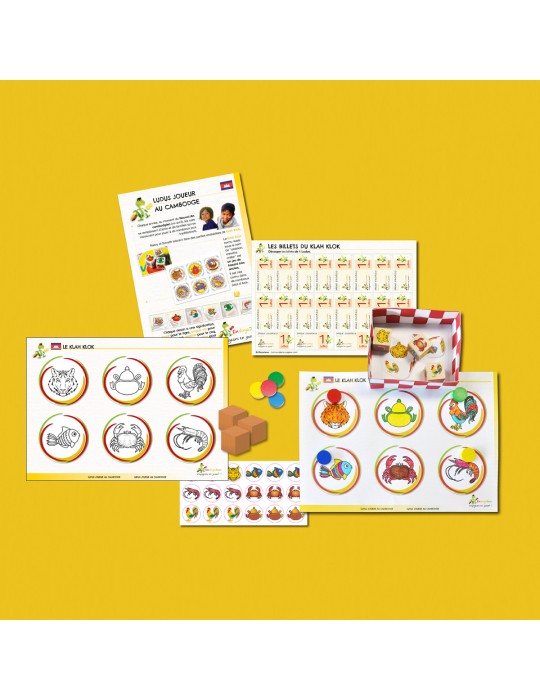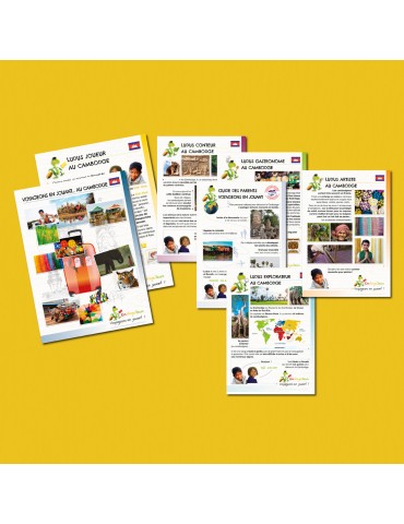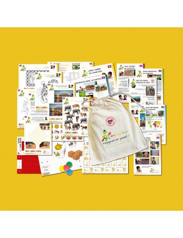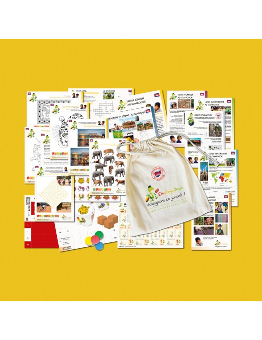 Contenu : le guide des parents qui décrit les différentes activités, - les livrets Ludus EXPLORATEUR, GASTRONOME, JOUEUR, ARTISTE et CONTEUR pour découvrir le Cambodge sous toutes ses facettes, - le Klah Klok : un jeu de société à fabriquer avec le matériel inclus, - 1 loisir créatif (matériel inclus) : fabrication d'une boîte tressée, - 2 coloriages pour les enfants… et 1 pour les plus grands, - des jeux pour continuer le voyage : 7 différences, des charades et devinettes, les doubles, le labyrinthe et mots fléchés.