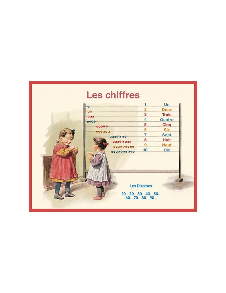 Joli tableau vintage idéal pour apprendre les chiffres et les lettres. Au recto, les chiffres sont illustrés par un ancien boulier. Au verso, l'alphabet est écrit sur un tableau noir en lettres manuscrites et d'imprimerie en majuscule et minuscule. Tableau cartonné de grande qualité. Possibilité de l'accrocher au mur grâce à un œillet situé en haut du tableau.