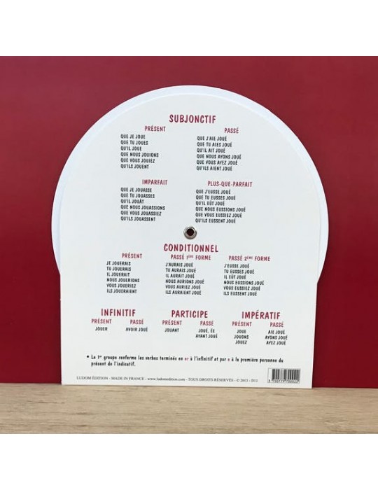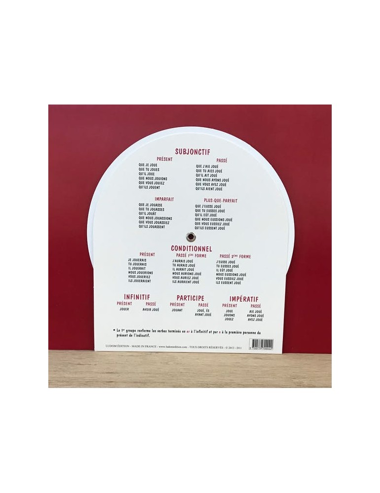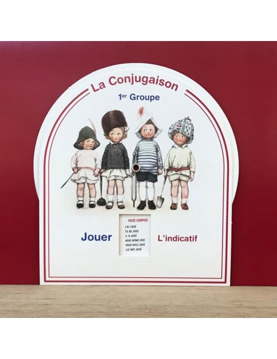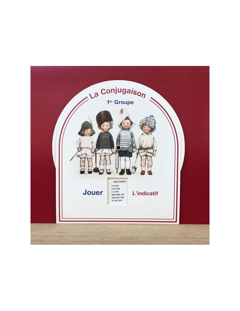 Comment apprendre la conjugaison en s'amusant ? Il suffit que l'enfant tourne la rondelle du disque et tous les temps de l'indicatif du verbe "Jouer" apparaissent dans une petite fenêtre. Les autres temps sont au dos. Des enfants déguisés illustrent joliment le disque animé au style vintage.