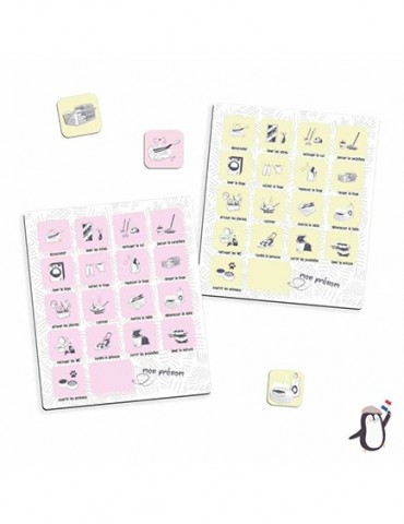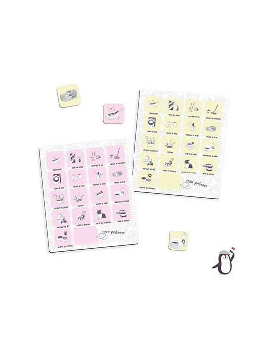 36 magnets ( 2/2 cm) : épousseter, laver les vitres, nettoyer le sol, passer la serpillère, laver le linge, sécher le linge, repasser le linge, ranger le linge, arroser les plantes, cuisiner, mettre la table, débarrasser la table, nettoyer les WC, tondre la pelouse, sortir les poubelles, laver la voiture, nourrir les animaux