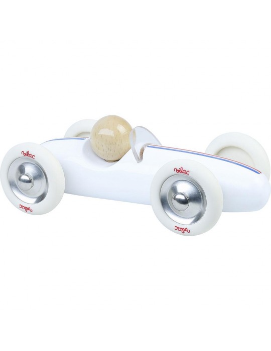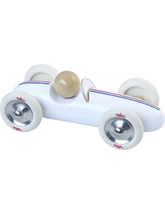 Belle voiture en bois massif laqué. Modèle Grand Prix vintage coloris blanc de 18 cm de long.