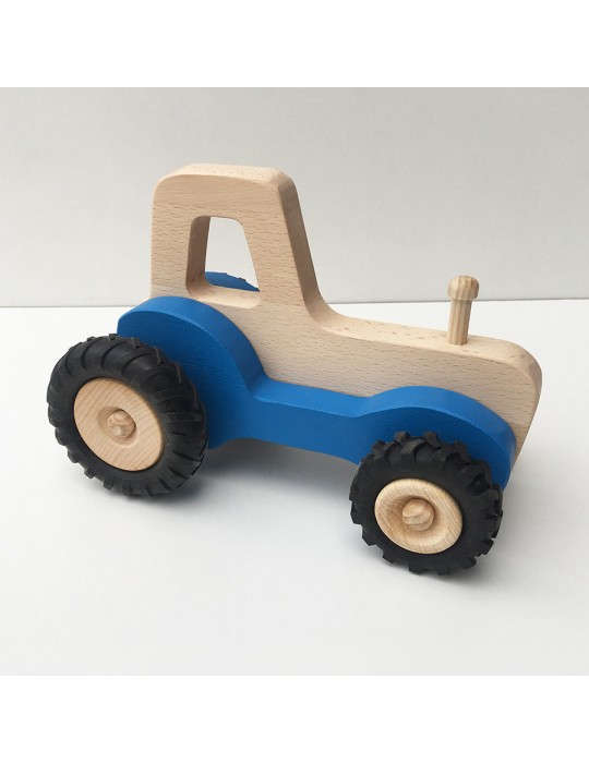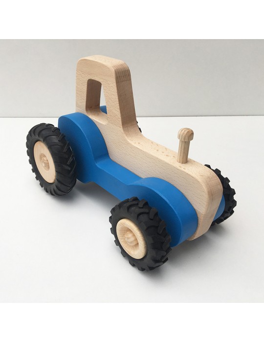 Tracteur en bois disponible en plusieurs couleurs.