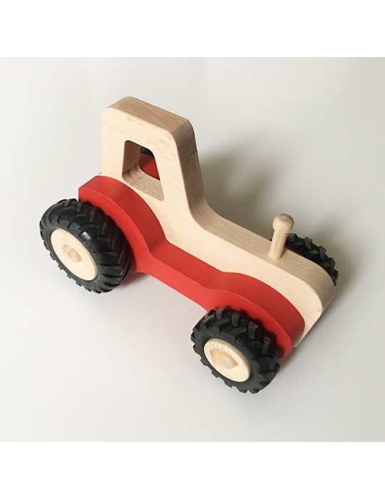 Tracteur en bois disponible en plusieurs couleurs.
