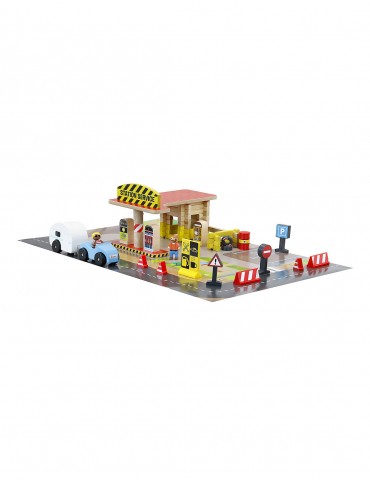 Petite station essence en bois à construire avec un tapis de jeu décoré et des petits personnages pour s'inventer des histoires et travailler l'imaginaire.