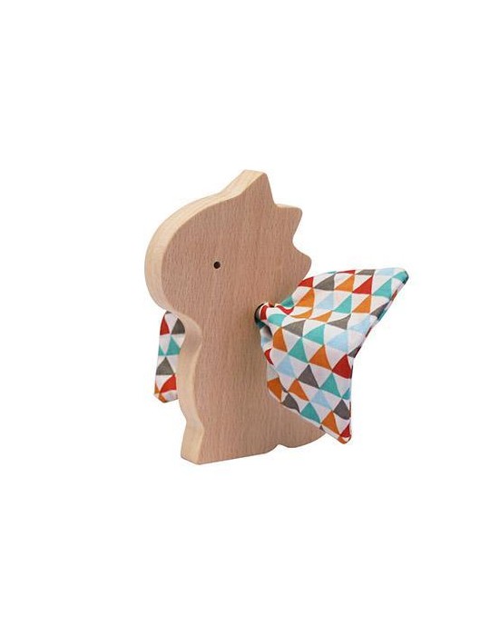Figurine en bois représentant un adorable petit dragon. Ses ailes sont confectionnées avec un tissu coton 100% bio. Elles sont amovibles. L'enfant s'amusera à les retirer et à les remettre.