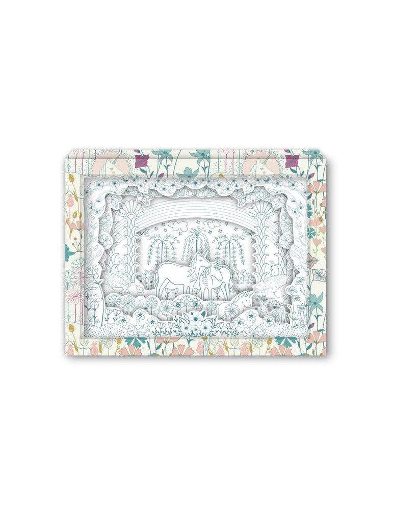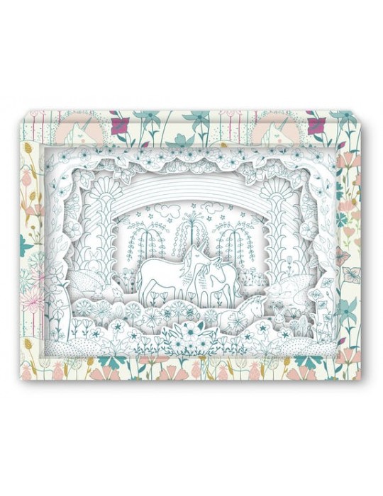 Une box deco 3D à colorier pour décorer sa chambre : 4 panneaux, univers licorne, à colorier aux crayons de couleur, aquarelle, ou touches de feutre (non fournis), puis à insérer dans la box.