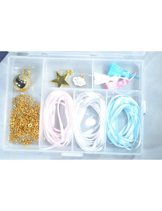 Un bola de grossesse lisse plaqué or 20mm - grande taille. Une chaine pour bola 114cm plaqué or - maille 2mm. Trois cordons satins pour bola 114cm blanc, bleu et rose pour changer de couleur avec vos tenues vestimentaires. Un pendentif petit nuage blanc et doré. Un pendentif étoile doré. Un pompon blanc en satin. Un pompon bleu turquoise en satin. Un ponpon rose en satin. Une Box cadeau. Une boite de rangement pendentifs bola. Un sac en tissus bleu.
