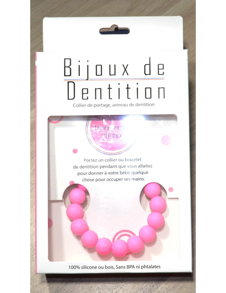 Parfait pour occuper bébé ou pour soulager ses poussées dentaires ! Le bracelet ou anneau de dentition Irréversible permet aux mamans d'être chics et élégantes avec un design tendance pour maman & bébé. Quelle utilité ? Aide à créer un lien avec bébé et favoriser une concentration lors des tétées. Lavable au lave-vaisselle pour un nettoyage facile. 100% silicone, Sans BPA ni phtalates. Les bracelets, hochets ou anneau de dentition ne contiennent pas de pièces amovibles. Ce bracelet sera un accessoire idéal pour occuper bébé lors des sorties, pendant le portage ou l'allaitement mais également pour le soulager lors des poussées dentaires. Mais à quoi ça sert? Et bien pour celles qui ont testé l'allaitement, c'est pour éviter: – les griffures – les doigts dans le nez – les doigts dans les yeux – le renversement de la tasse de thé – les doigts dans la bouche – les pincements – les tirages de cheveux De plus, la texture douce et stimulante du collier apaise la douleur de la dentition. Excellent outil sensoriel - aidez le bébé à se concentrer. Le cadeau parfait pour les nouvelles et futures mamans. Les perles sont 100% silicone (similaire aux sucettes et aux tétines) et peuvent être "mordillées" en toute sécurité par les bébés. Facile à nettoyer, lavable au lave-vaisselle