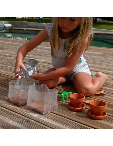 Contient : des planches d'instructions 2 carrés coco 10 x10 cm à réhydrater 4 spatules en bois + élastiques + blisters pour créer une catapulte à graines ! 2 petites plaquettes de terre de diamètre 30mm à réhydrater 2 pots en terre cuite 2 coupelles en terre cuite 3 sachets de graines faciles et rapides à pousser : gazon, haricot et capucine