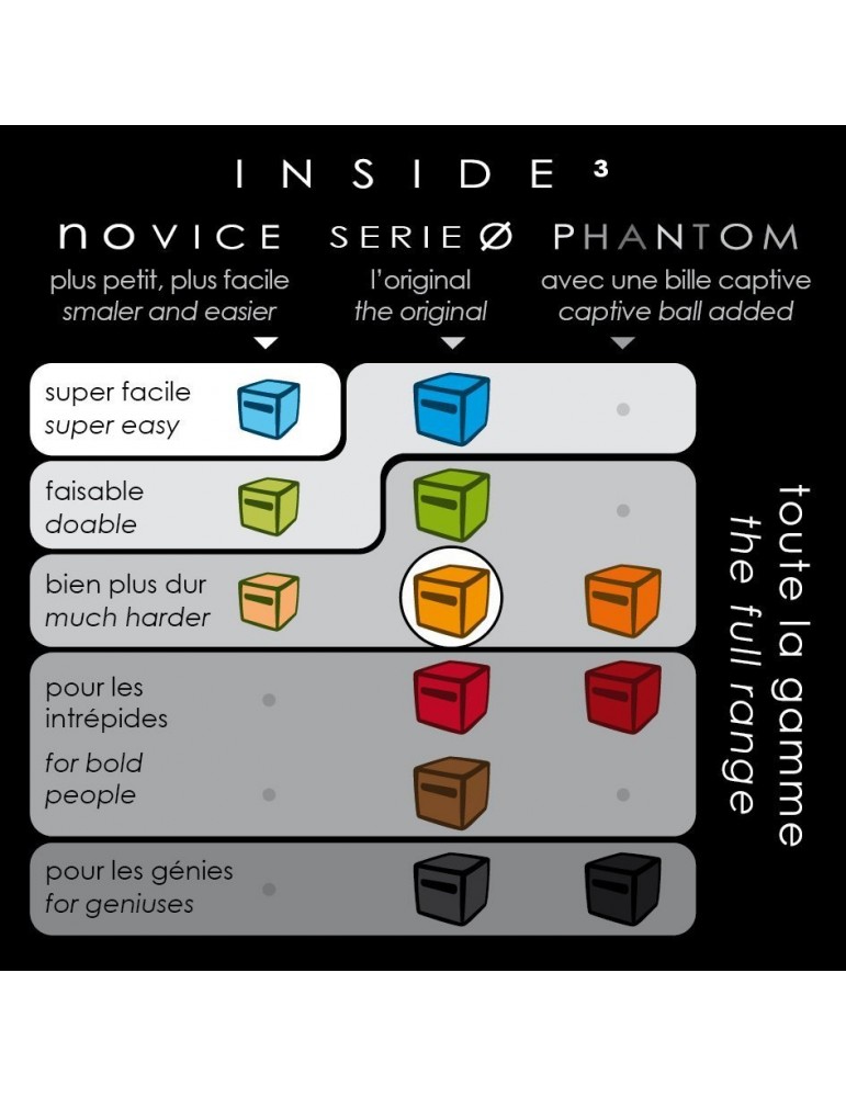 Inside3 c'est un labyrinthe caché à l'intérieur d'un cube. On joue à l'aveugle en s'aidant du plan gravé en surface.
