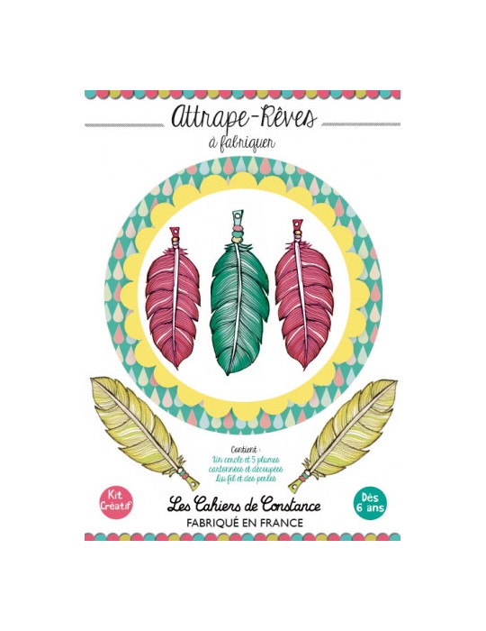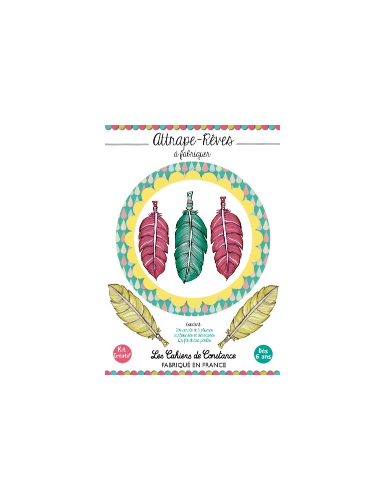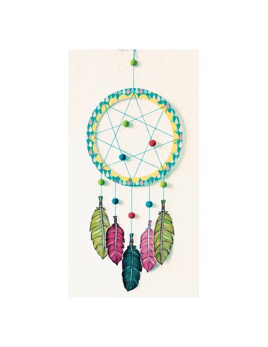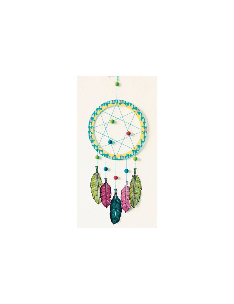 Ce kit contient cinq plumes, un cercle cartonné, du fil et des perles pour réaliser un attrape-rêves aux couleurs de la nature. Imprimé au recto et au verso, il peut aussi servir de mobile. D'ailleurs, il fera un beau cadeau déco fait main.