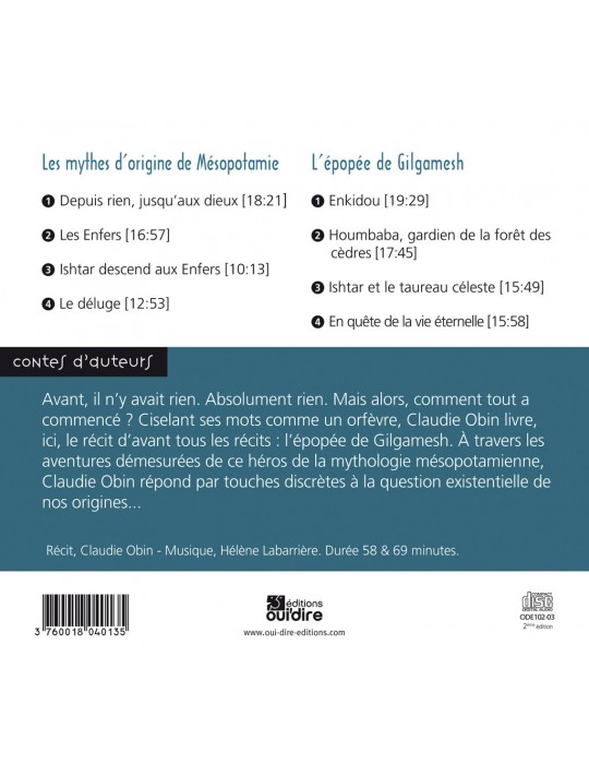 Avant, il n’y avait rien. Absolument rien. Mais alors, comment tout a commencé ? Ciselant ses mots comme un orfèvre, Claudie Obin livre, ici, le récit d’avant tous les récits : l’épopée de Gilgamesh. À travers les aventures démesurées de ce héros de la mythologie mésopotamienne, Claudie Obin répond par touches discrètes à la question existentielle de nos origines