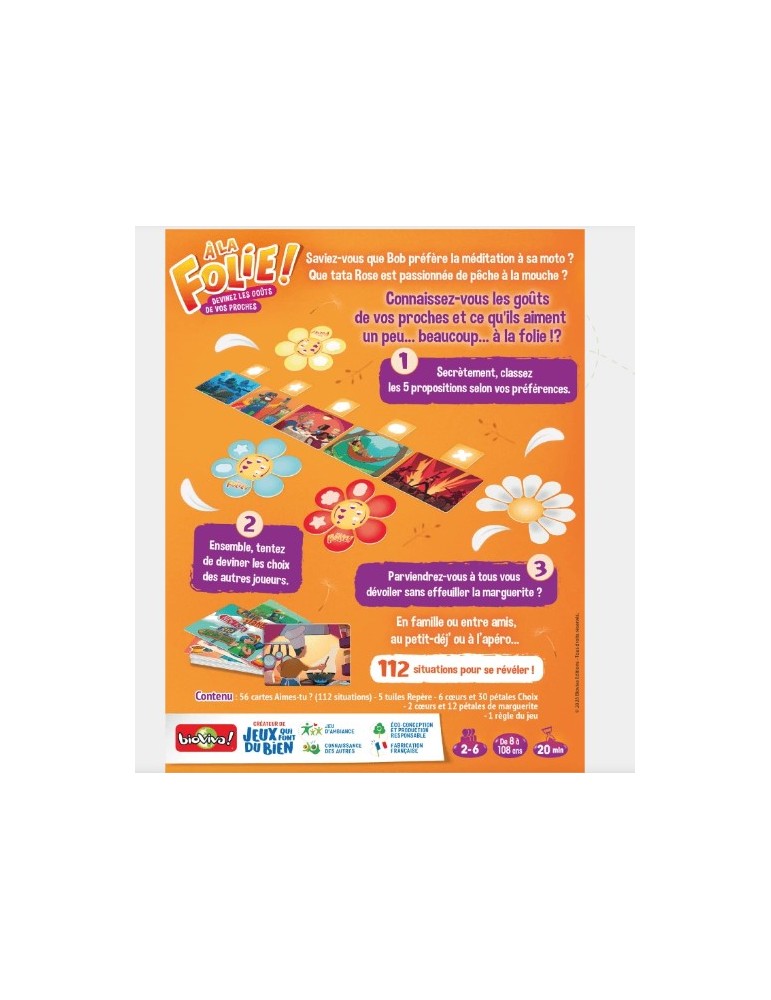 Saviez-vous que Sam préfère la méditation à sa moto ? Que tata Rose est passionnée de pêche à la mouche ? Dans À la folie !, les joueurs tentent de déterminer, dans le bon ordre, les goûts et activités préférés des autres joueurs… avant qu’il n’y ait plus de pétales sur la marguerite !