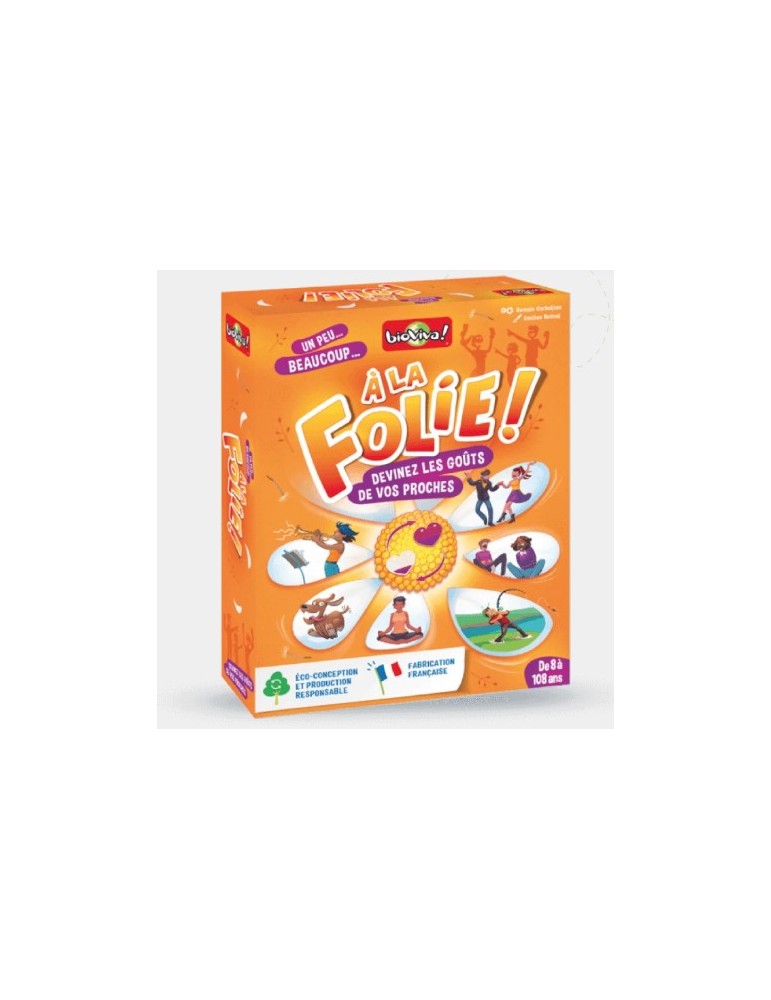 Dans ce jeu coopératif, les joueurs dès 8 ans tentent de deviner les goûts de leurs proches. En famille ou entre amis, au petit-déj’ ou à l’apéro… Dans À la folie, révélez-vous au travers de 112 situations et découvrez des facettes méconnues et surprenantes de la personnalité des autres joueurs !