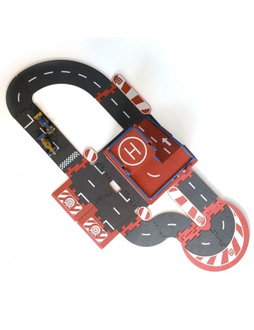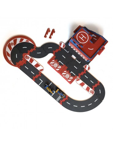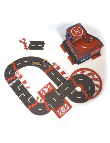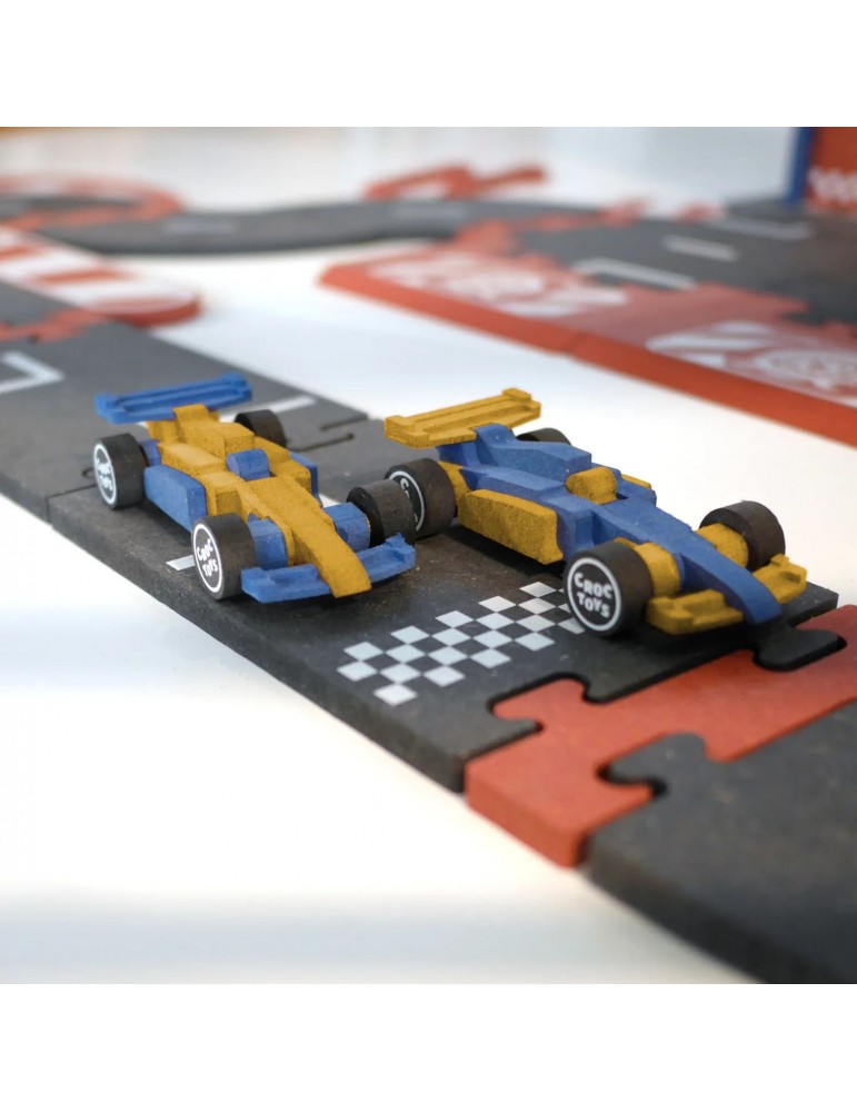 Se monte en 2 minutes et s’accompagne d’un lot de route pour étendre l’espace de jeu ainsi que deux formules Croctoys pour filer sur le circuit !