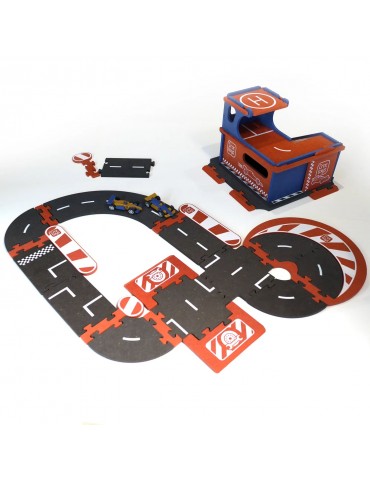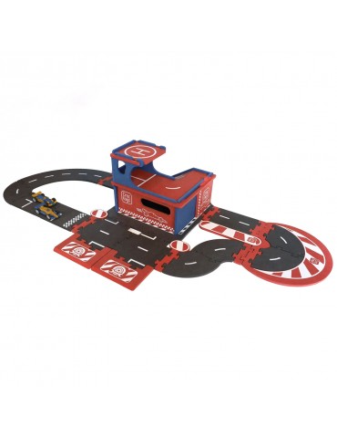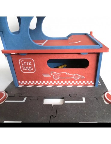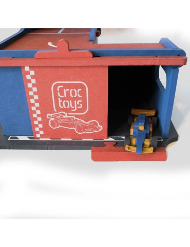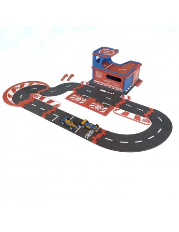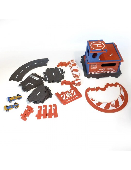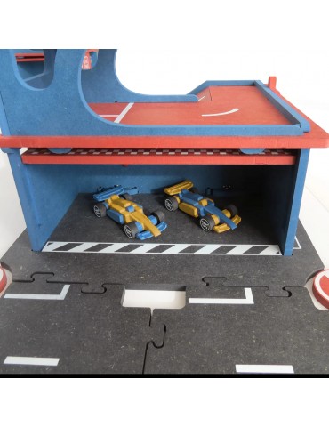Garage à construire accompagné d’un circuit de course (25 pièces) et de deux Formules croctoys à assembler