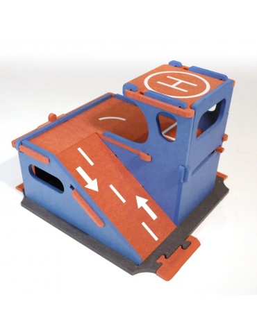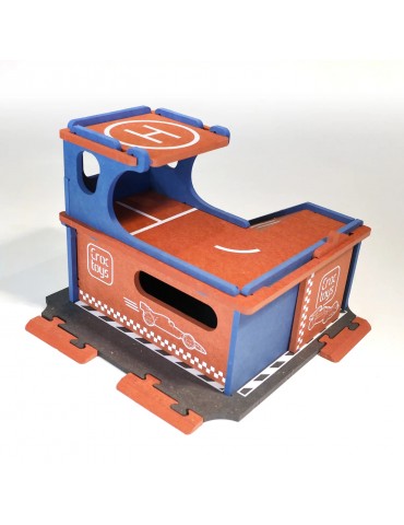 Un garage à monter soit même de manière ingénieuse, en bois de couleur rouge, noire et bleu. Il est conçu pour durer !