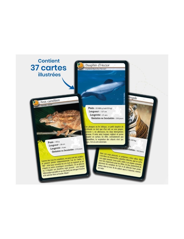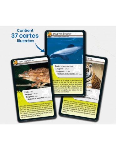 Le porc-épic ballon pèse 3500 g… peut-il remporter la bataille contre la méduse immortelle ou le basilic vert ? Oui ! Il l’emporte car il est le plus lourd (la méduse immortelle pèse 1 g et le basilic vert 150 g). Attention, le degré de menace qui pèse sur les espèces peut retourner la situation lors des batailles ! Si l’animal d’un joueur est plus menacé que celui du joueur qui a ouvert la manche, il peut changer la caractéristique d’affrontement.