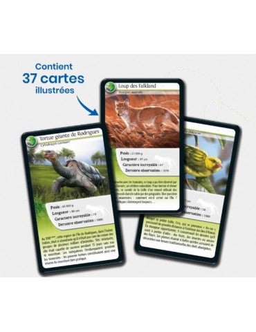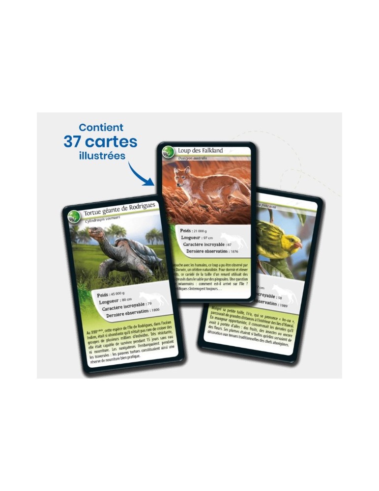 Chaque carte Défis Nature - Animaux disparus comporte une illustration de l’animal, ses caractéristiques (« poids », « longueur », « caractère incroyable », « dernière observation ») ainsi que du contenu éducatif pour en savoir plus sur l’espèce. Parfait pour apprendre en s’amusant !