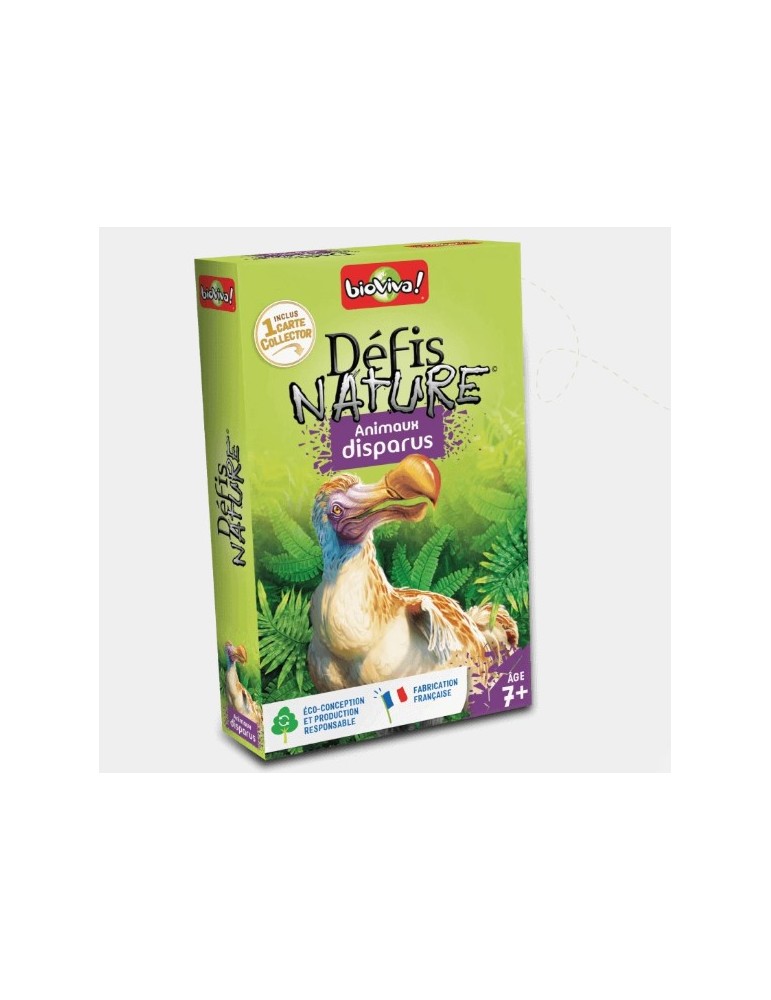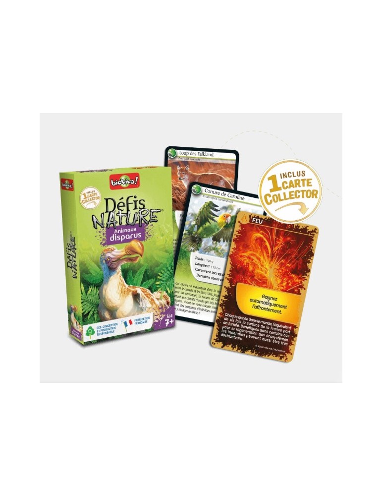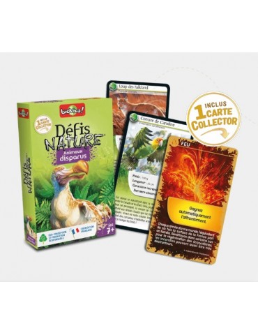 Une carte Collector aléatoire est incluse dans le jeu de cartes Défis Nature - Animaux disparus. Elle permet aux joueurs de découvrir un phénomène naturel (ex : Feu, Arc-en-ciel, Tornade, Éclipse, Grêle, Aurore Polaire…) et entraîne une action spécifique sur la manche. 18 cartes Collector sont disponibles, il est possible de se procurer les cartes Collector Défis Nature sur notre site internet !