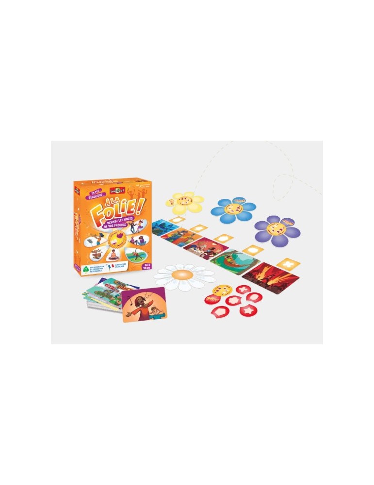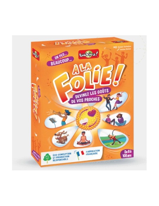 Dans ce jeu coopératif, les joueurs dès 8 ans tentent de deviner les goûts de leurs proches. En famille ou entre amis, au petit-déj’ ou à l’apéro… Dans À la folie, révélez-vous au travers de 112 situations et découvrez des facettes méconnues et surprenantes de la personnalité des autres joueurs !
