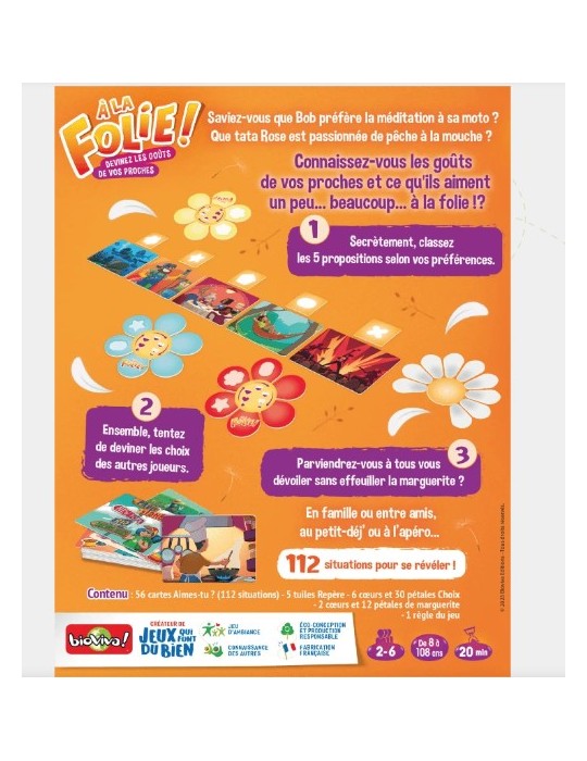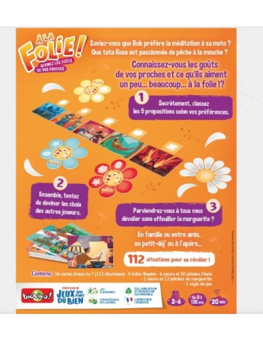 Saviez-vous que Sam préfère la méditation à sa moto ? Que tata Rose est passionnée de pêche à la mouche ? Dans À la folie !, les joueurs tentent de déterminer, dans le bon ordre, les goûts et activités préférés des autres joueurs… avant qu’il n’y ait plus de pétales sur la marguerite !