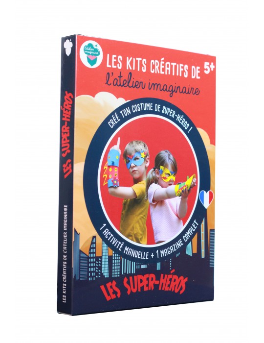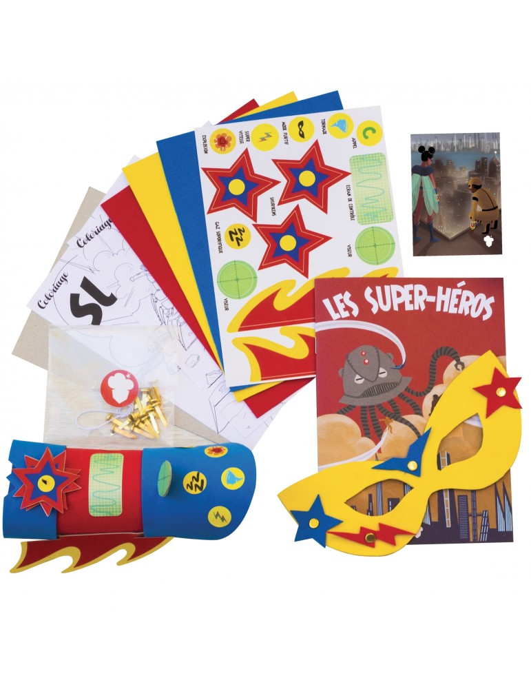 un livret 20 pages sur le thème des super-héros - un pas à pas illustré de l'activité manuelle - 3 feuilles de papier mousse ( jaune, rouge, bleu ) - 1 fiche cartonnée pour créer les accessoires - 1 planche d'autocollant colorés - 15 attaches parisiennes - 1 fil élastique - 1 joli autocollant