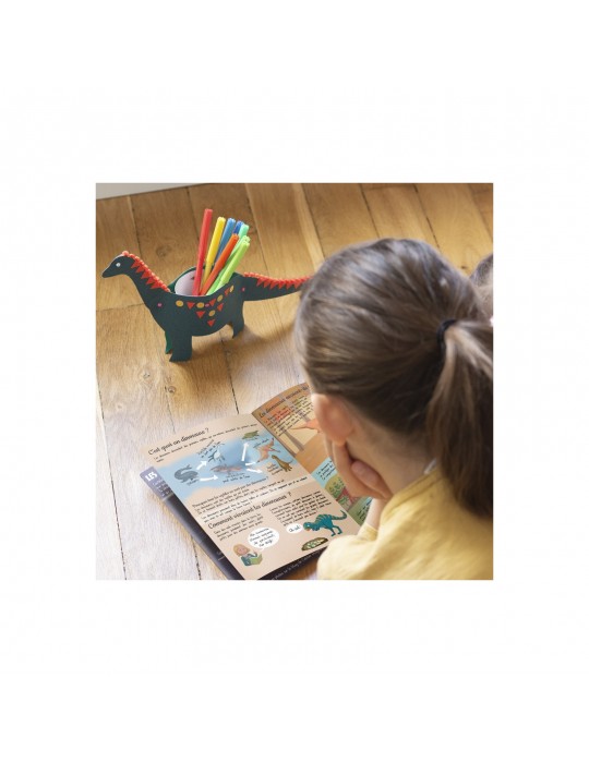 Atelier créatif permettant de réaliser un Diplodocus pot à crayons et découvrir ces incroyables créatures grâce à un livret illustré .
