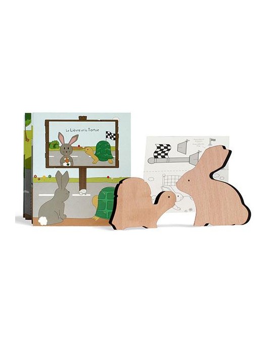 Coffret cadeau pour enfant idéal pour découvrir le plaisir de la lecture à travers le jeu. Lisez et jouez la fable de La Fontaine "Le lièvre et la tortue" avec ce joli coffret bilingue