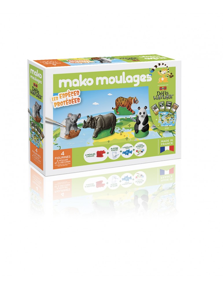 Un coffret créatif pour mouler, démouler et peindre 4 animaux : un panda géant, un koala, un tigre du Bengale et un rhinocéros de Sumatra. Vous trouverez également dans ce coffret 4 cartes Défis nature pour découvrir plus en détaille ces espèces protégées, ainsi qu'un planisphère.