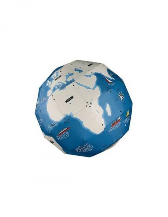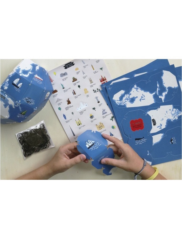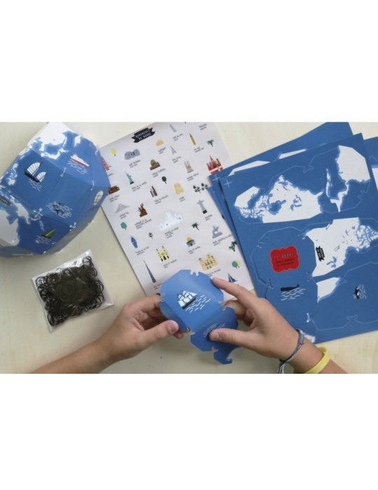 Une activité créative sans colle ni ciseaux. Les fuseaux de papier s'assemblent habilement grâce à des élastiques pour former un globe terrestre en 3D. Sur chaque facette de la belle planète bleue, il ne reste plus qu’à coller au bon endroit les stickers représentant des grands monuments du monde, arbres, sapins et palmiers. Se repérer devient alors un jeu d’enfant !