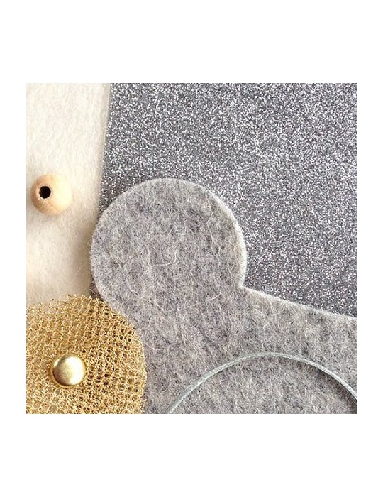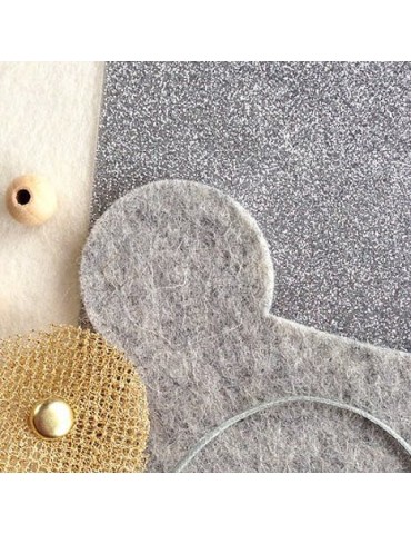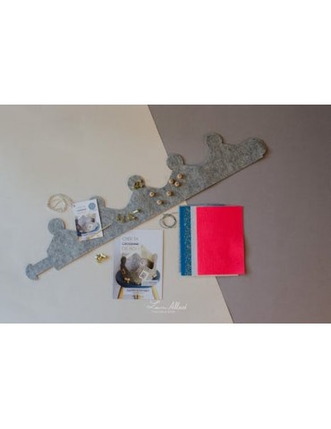 Un joli coffret avec de la matière pour s'amuser : une couronne découpée dans du feutre de laine gris chiné, chic et mixte (100% pure laine vierge et certifié oekotex 100), avec de petits trous préformés pour pouvoir y accrocher avec des attaches parisiennes ses propres pierres précieuses... Pour les réaliser, il suffit de se servir des modèles et de découper les formes dans le glitter argenté, le feutre naturel et le tulle doré. Nous avons également glissé nos belles perles de bois du Jura et notre beau cordon ciré français !