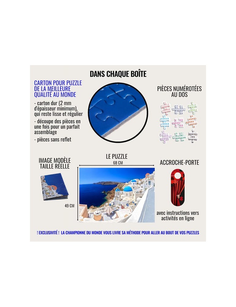 Conseils, image modèle taille réelle (49 x 68 cm), numérotation des pièces par zone. Vous pouvez même faire des puzzles de 100 pièces puis les assembler.